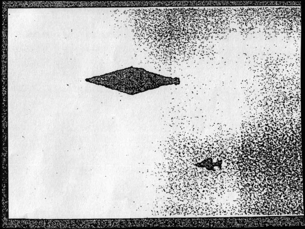 A line drawing of one of the Calvine photographs created for imagery analysis. The Minister’s reply in July 1996 that ‘we have no record of any photographs being taken from them [the negatives]’ may have been correct, as photos were provided by the witnesses in any case. (Crown Copyright)Buried in a batch of MOD UFO files released in March 2009 were a couple of very crude images showing a large diamond-shaped object as well as a single aircraft, which appeared to resemble a Harrier. According to Nick Pope, when interviewed by UAP Media UK member Andy McGrillen on That UFO Podcast in October 2020, they were “a couple of very poor quality black and white photocopies of an old line drawing of one of the photos, which looked almost cartoonish.” Whether this original line drawing, which would have been used for imagery analysis, was the same one requested as per the copy of the DIS(SP)OPS Imagery Tasking Form released back in March 2009, is unknown. No annotation or analysis accompanies these images, nor is there any sense of scale, size or distance. The files do not reveal whether the two witnesses were contacted for follow-up questioning about their sighting.